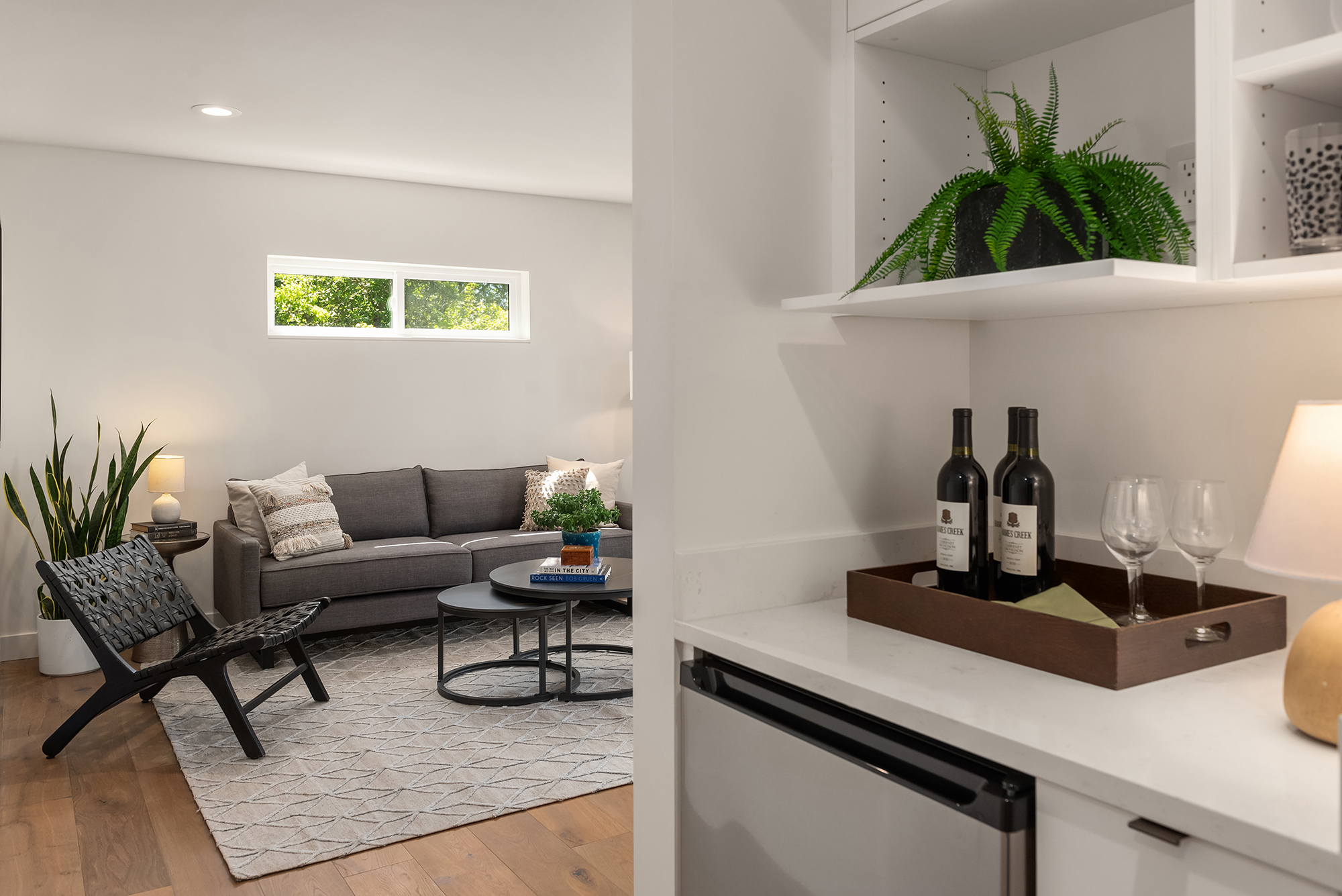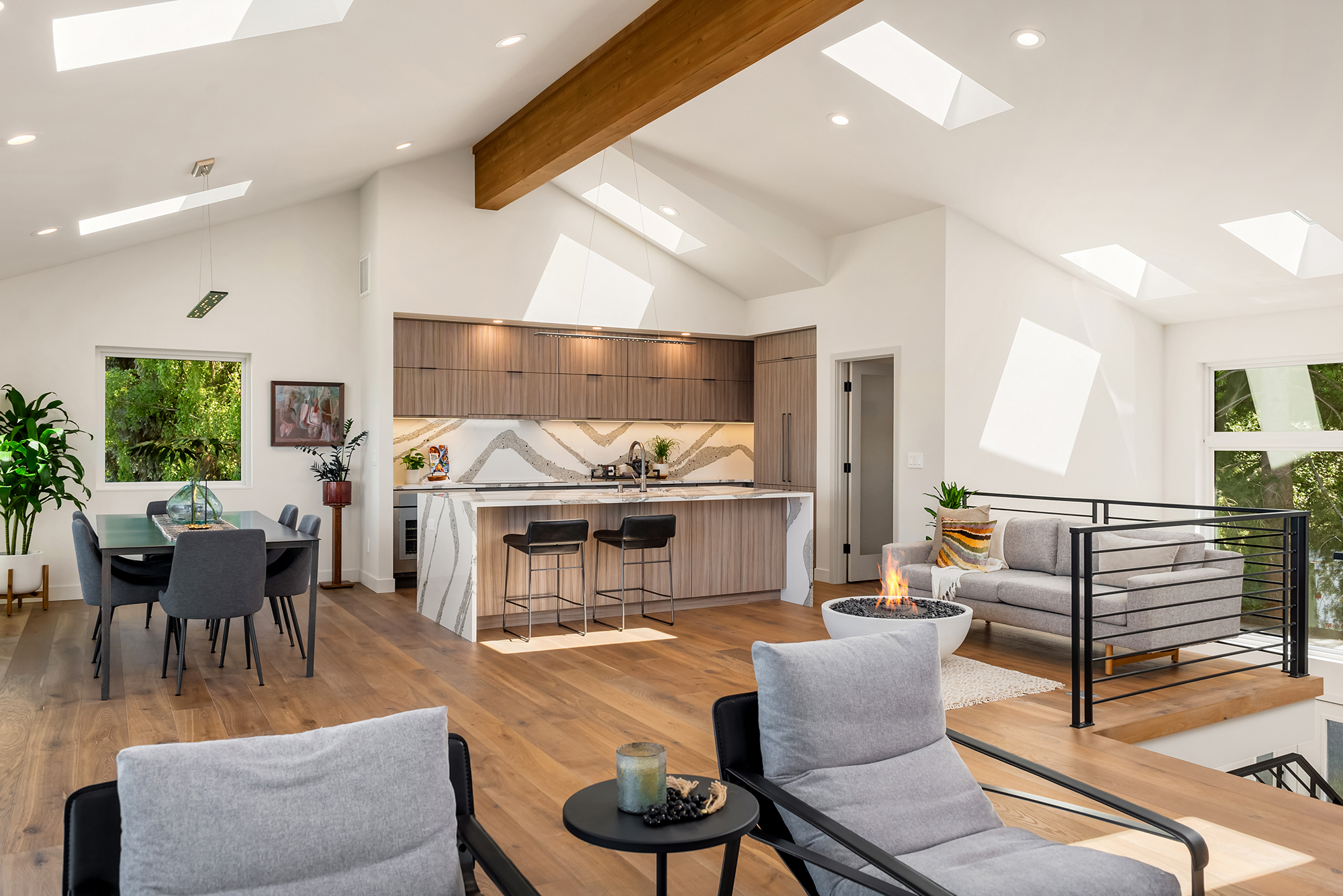 accessible here, we recount many of the unique details of the house that we are proud of and sad to part from — the hidden, pull-out kitchen vent, the jetted sink in the laundry room, the steam shower with a huge picture window of the sky, the muralist painting of kitchen electrical outlets, the rapid EV charging outlets, an indoor firepit, the effort to insure that rooms— even the basement and garage —have natural light from multiple angles, and more.