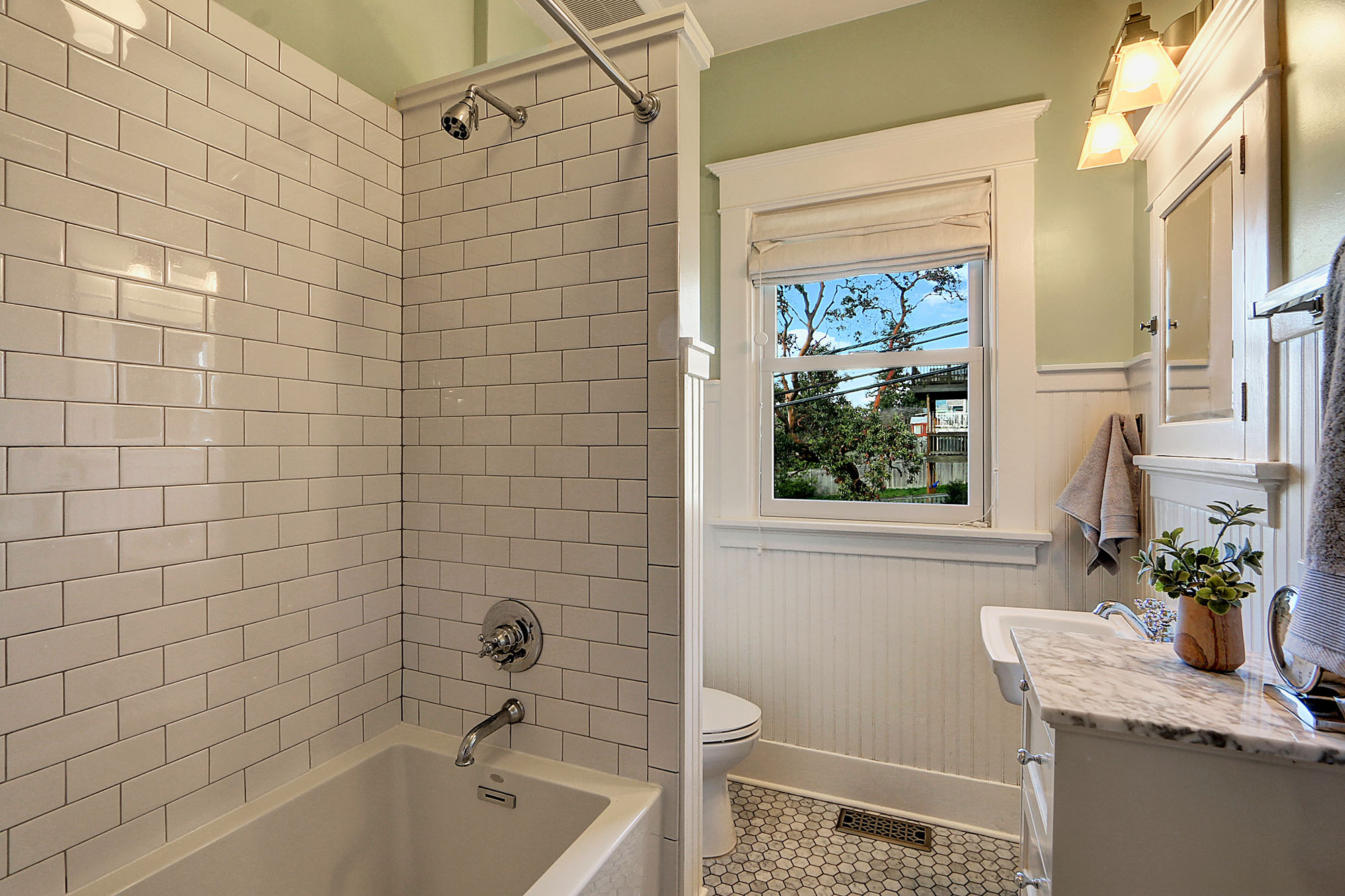 Bathroom remodel w/ carrera marble hex tile